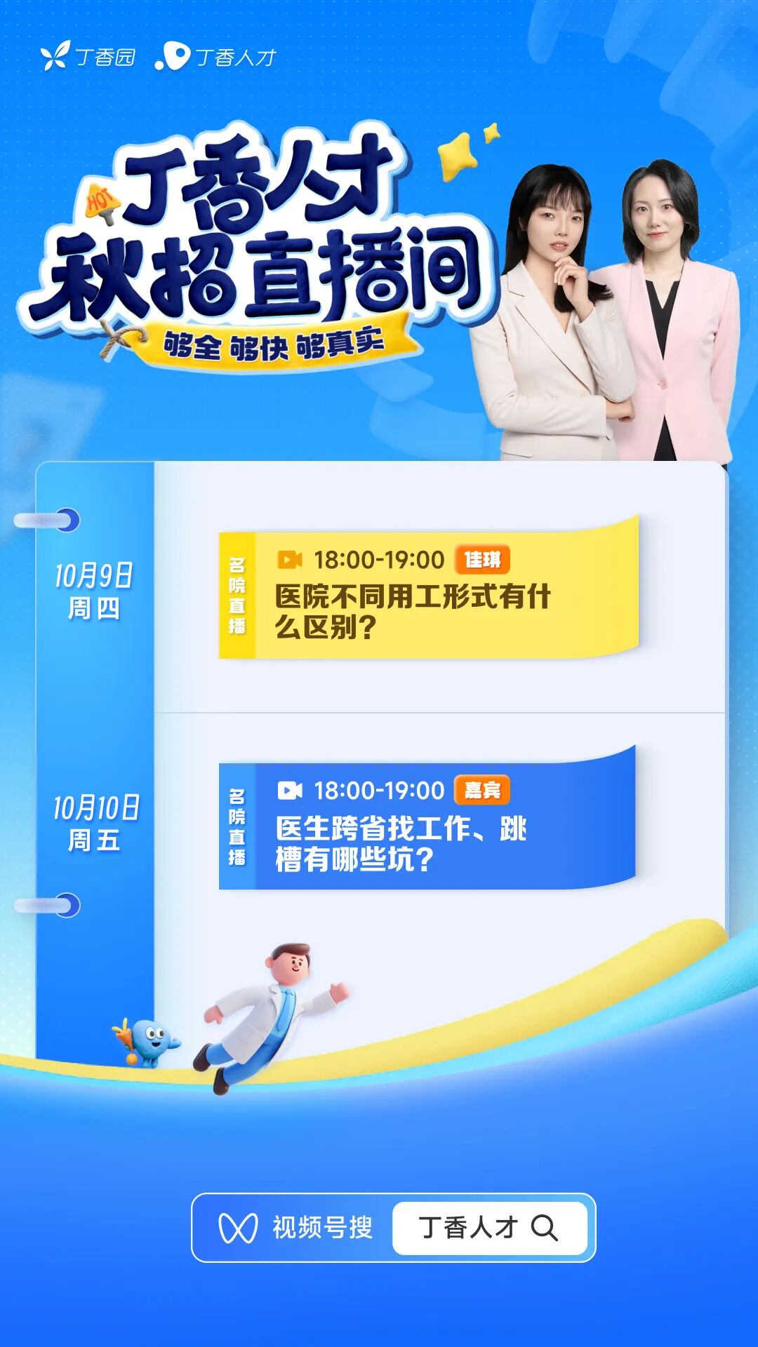 丁香人才名院直播: 与千万医护同行实时找工作、聊薪资,一起打破地区、院间信息差,助力 260 万医护求职!