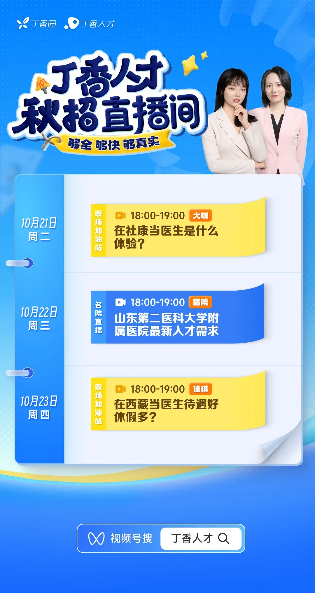 丁香人才名院直播: 与千万医护同行实时找工作、聊薪资,一起打破地区、院间信息差,助力 260 万医护求职!