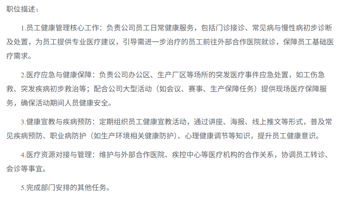 其中 岗位职责 描述的很详细,总的来说就是负责公司员工的日常健康,定期进行科普宣教,为其提供一些医疗建议;遇到病情比较严重的,指导他们去社会上的正规医院进行下一步诊疗;偶有突发医疗事件,需要进行一个初步的应急处理,保障员工安全。