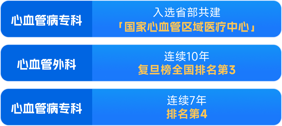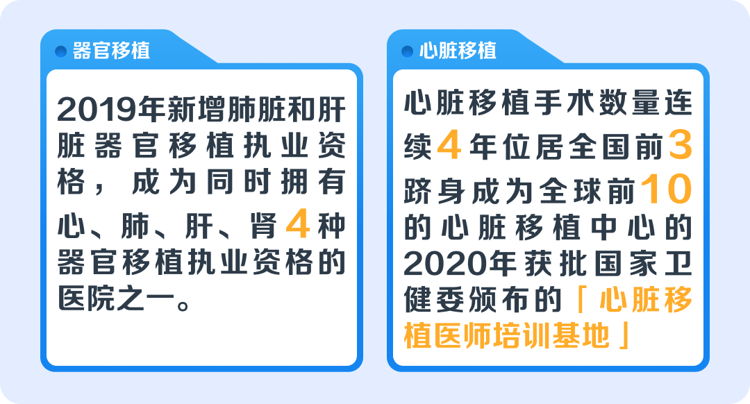 2019 年 心血管病专科入选省部共建「国家心血管区域医疗中心」;心血管外科连续 10 年复旦榜全国排名第 3,心血管病专科连续 7 年排名第 4。2019 年新增肺脏和肝脏器官移植执业资格,成为同时拥有心、肺、肝、肾 4 种器官移植执业资格的医院之一。心脏移植手术数量连续 4 年位居全国前 3,跻身成为全球前 10 的心脏移植中心。