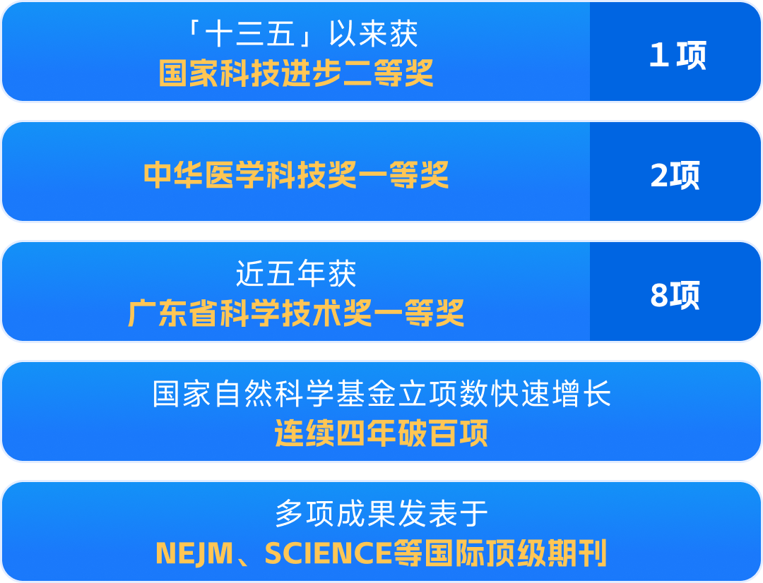 组建大团队、构筑大平台、组织大项目、实现大目标。「十三五」以来获国家科技进步二等奖1项、中华医学科技奖一等奖 2 项,近五年获广东省科学技术奖一等奖 8 项;近三年国家自然基金立项数快速攀升,多项成果发表于 NEJM、SCIENCE 等国际顶级期刊。