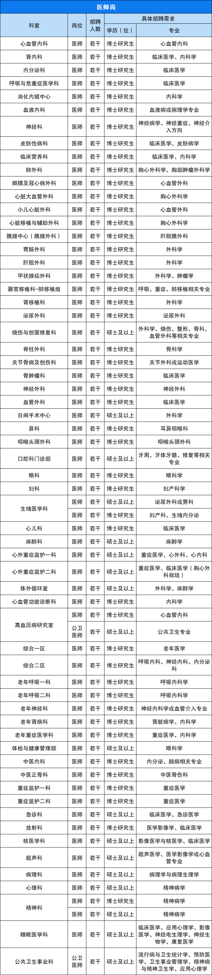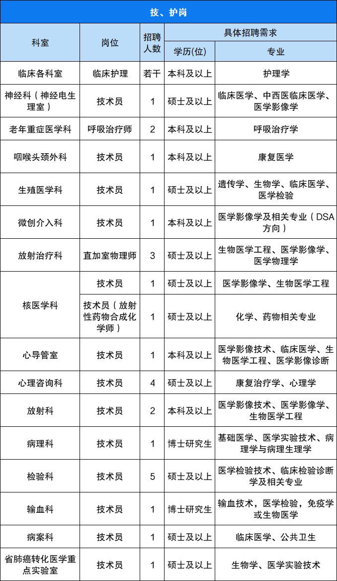 5. 满足相应岗位执业资格要求:护理岗位应聘者毕业前须参加护士执业资格考试,入职前如未能取得护士执业资格,不予录用;医师岗位应聘者入职时如未取得住院医师规范化培训合格证,须按国家统一要求在我院完成住院医师规范化培训并取得合格证。