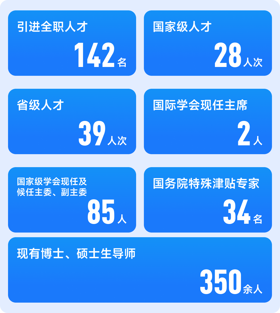 医院通过「拔高顶部、壮实腰部、夯实底部」的人才战略,打造高质量发展主力军。实施「五个五」、「五个三」、双青人才计划、后备人才培育等优秀人才奖励计划,激发人才活力与潜能。近年来引进全职人才 142 名,学术队伍中拥有国家级人才 28 人次,省级人才 39 人次。国际学会现任主席 2 人, 国家级学会现任及候任主委、副主委 85 人。国务院特殊津贴专家 34 名。现有博士、硕士生导师 350 余人。