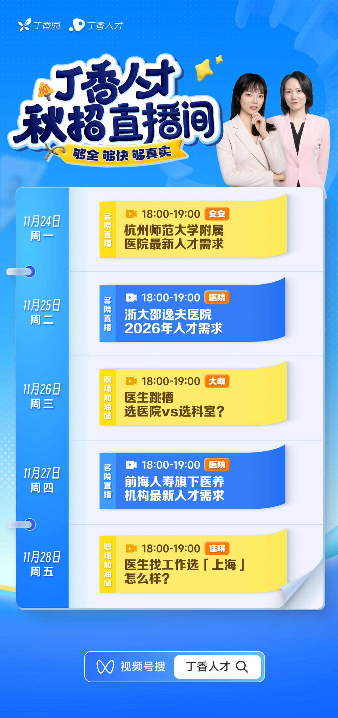 丁香人才名院直播: 与千万医护同行实时找工作、聊薪资,一起打破地区、院间信息差,助力 260 万医护求职!