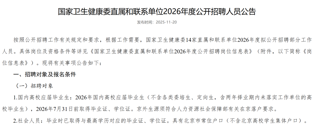 11 月 20 日,国家卫生健康委人才交流服务中心发布了《国家卫生健康委直属和联系单位 2026 年度公开招聘人员公告》: