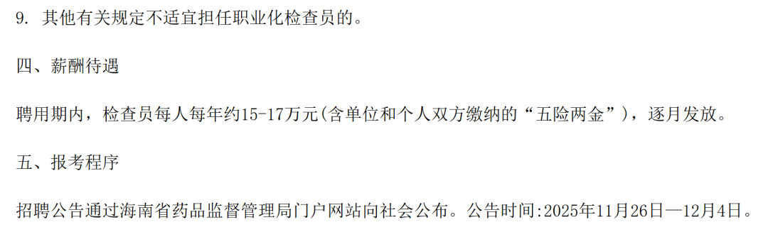 虽然标注了为非事业编制人员,但 明确放出了薪资待遇: 聘用期内,检查员每人每年约 15-17 万元 (含单位和个人双方缴纳的「五险两金」),逐月发放。