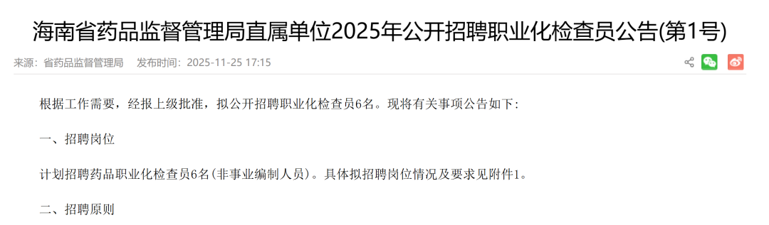 11 月 25 日,海南省药品监督管理局发布了《海南省药品监督管理局直属单位 2025 年公开招聘职业化检查员公告》:
