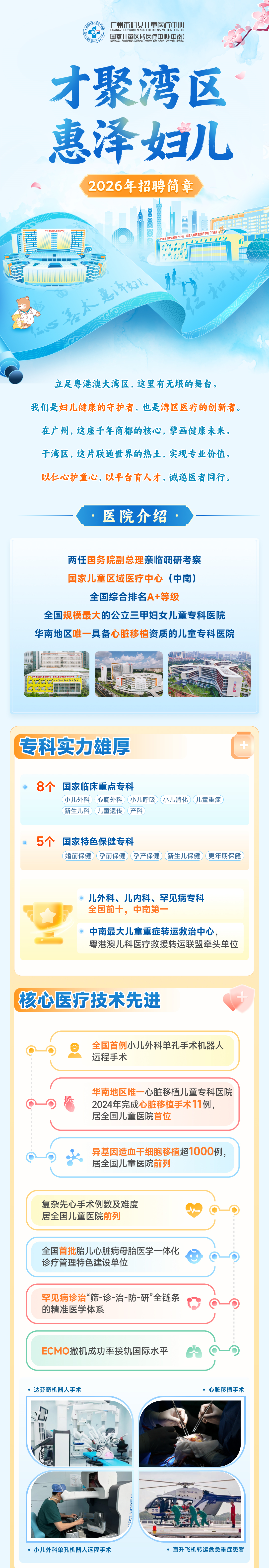 国家区域医疗中心 2026 年招聘公告 | 你就是我想要的人才 !日期:2025-12-09 来源:丁香人才公众号 广州市妇女儿童医疗中心 邀您加入 应聘 · 图片来源:广州市妇女儿童医疗中心 微信扫一扫分享资讯上一篇:80+ 个岗位招聘!中山大学肿瘤防治中心 2026 年招聘公告下一篇:丁香人才长期有偿征稿 | 用你的故事,直接发文章!