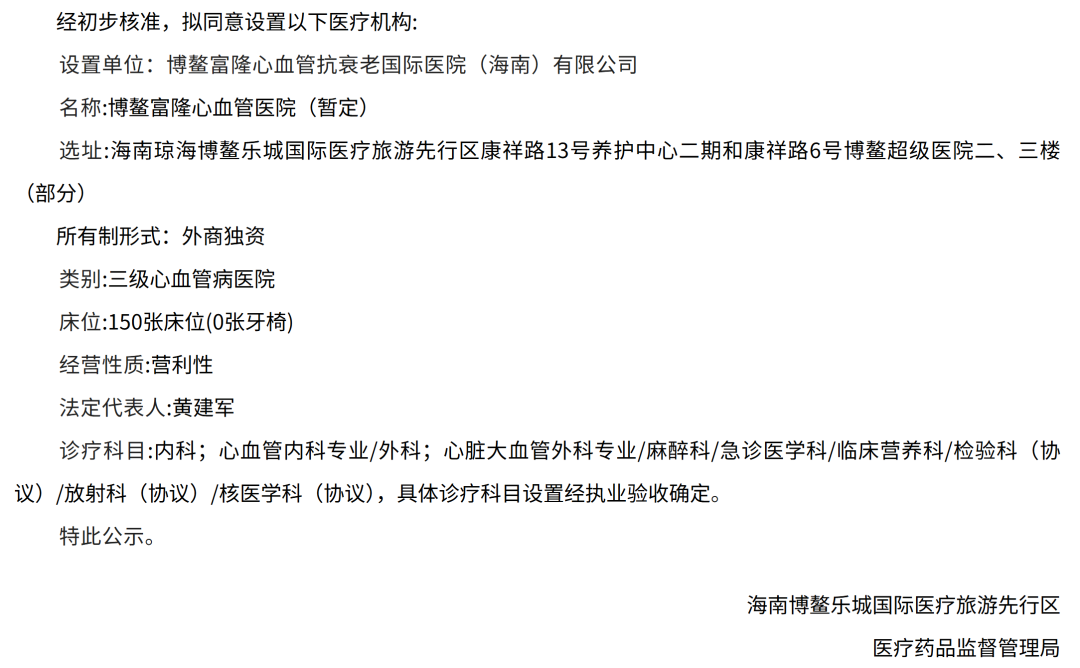 2025 年 12 月 2 日,海南省卫健委发布了《拟设置医疗机构公示(博鳌富隆心血管医院)》。 公告显示该医院定位是三级心血管病医院,诊疗科目包括心血管内外科、麻醉科、急诊医学科、临床营养科以及放射科等相关辅助科室,设置床位 150 张。