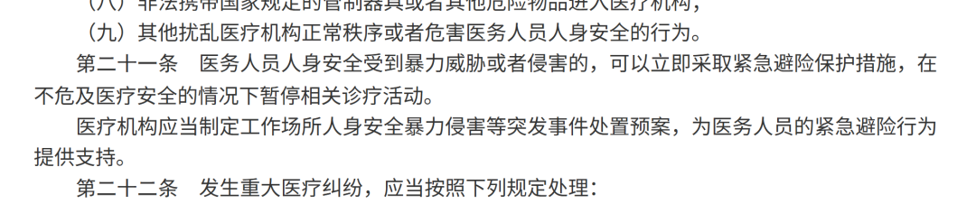 除了物理屏障,法规还明确提出,当医生判断人身安全受到威胁时 ,可以在不危及医疗安全的情况下暂停相关诊疗活动。