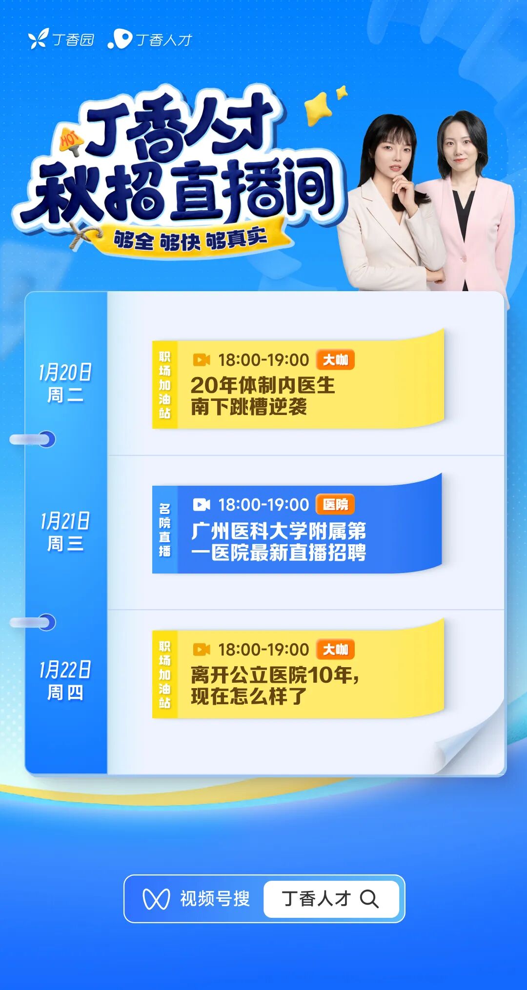 丁香人才名院直播: 与千万医护同行实时找工作、聊薪资,一起打破地区、院间信息差,助力 260 万医护求职!