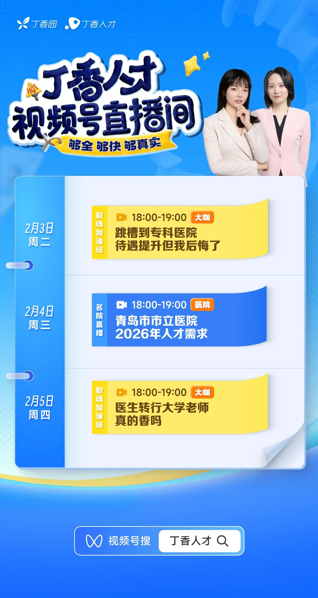 丁香人才名院直播:与千万医护同行实时找工作、聊薪资,一起打破地区、院间信息差,助力 260 万医护求职!