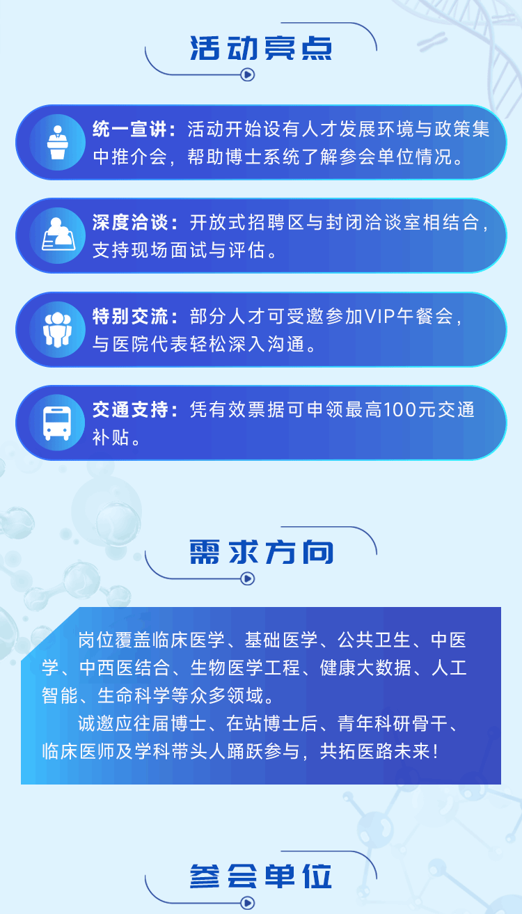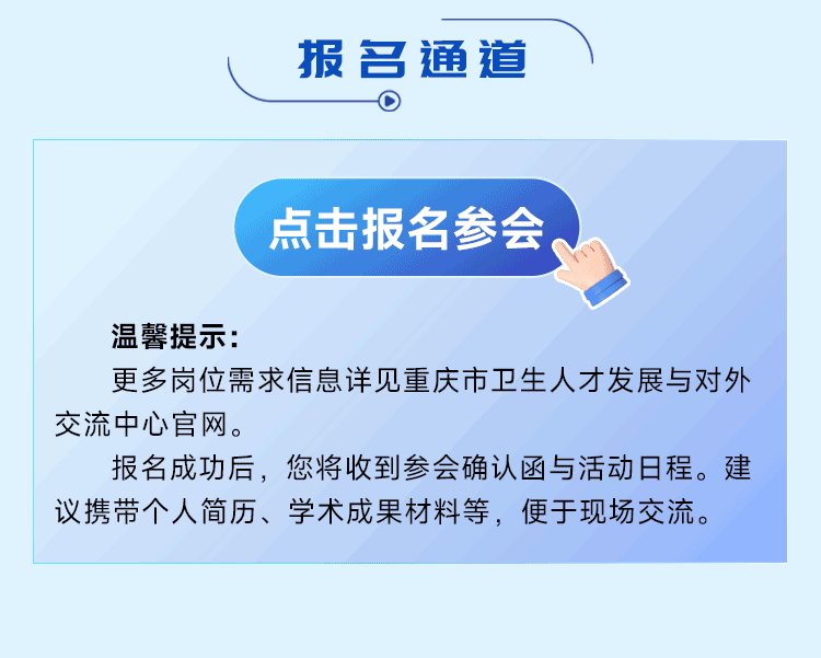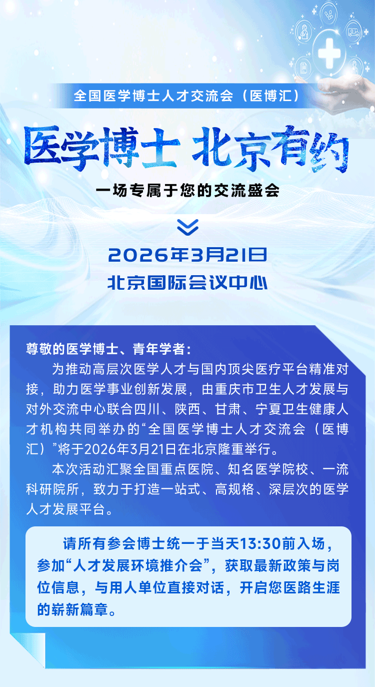 3 月 21 日,北京见!全国医学博士交流会重磅单位名单揭晓日期:2026-03-14 来源:丁香人才公众号 图片来源:重庆市卫生人才发展与对外交流中心微信扫一扫分享资讯上一篇:招 135 人!安徽省合肥市第二人民医院 2026 年公开招聘下一篇:2026 年福建中医药大学附属第三人民医院公开招聘高层次人才