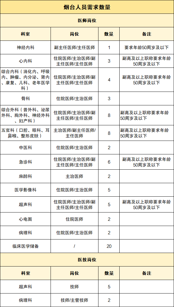 备注: 招录用人员到岗后,将按拟从事专业统筹派送济南等国内三级医院进修培训(部分岗位除外);待烟台玲珑英诚医院建成运营前,根据情况安排至烟台开发区工作。