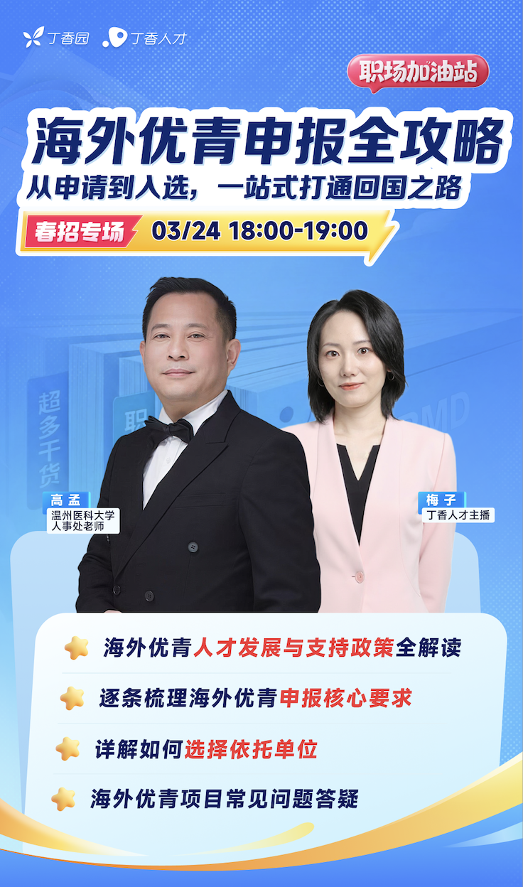 无论您正在筹备申报,还是未来有相关规划,想要全面了解 2026 海优申报全流程与申报攻略,这场直播你绝对不能错过!3 月 24 日 18:00,丁香人才邀请 温州医科大学人事处老师 高孟 高老师,直播分享海外优青项目申报全攻略!