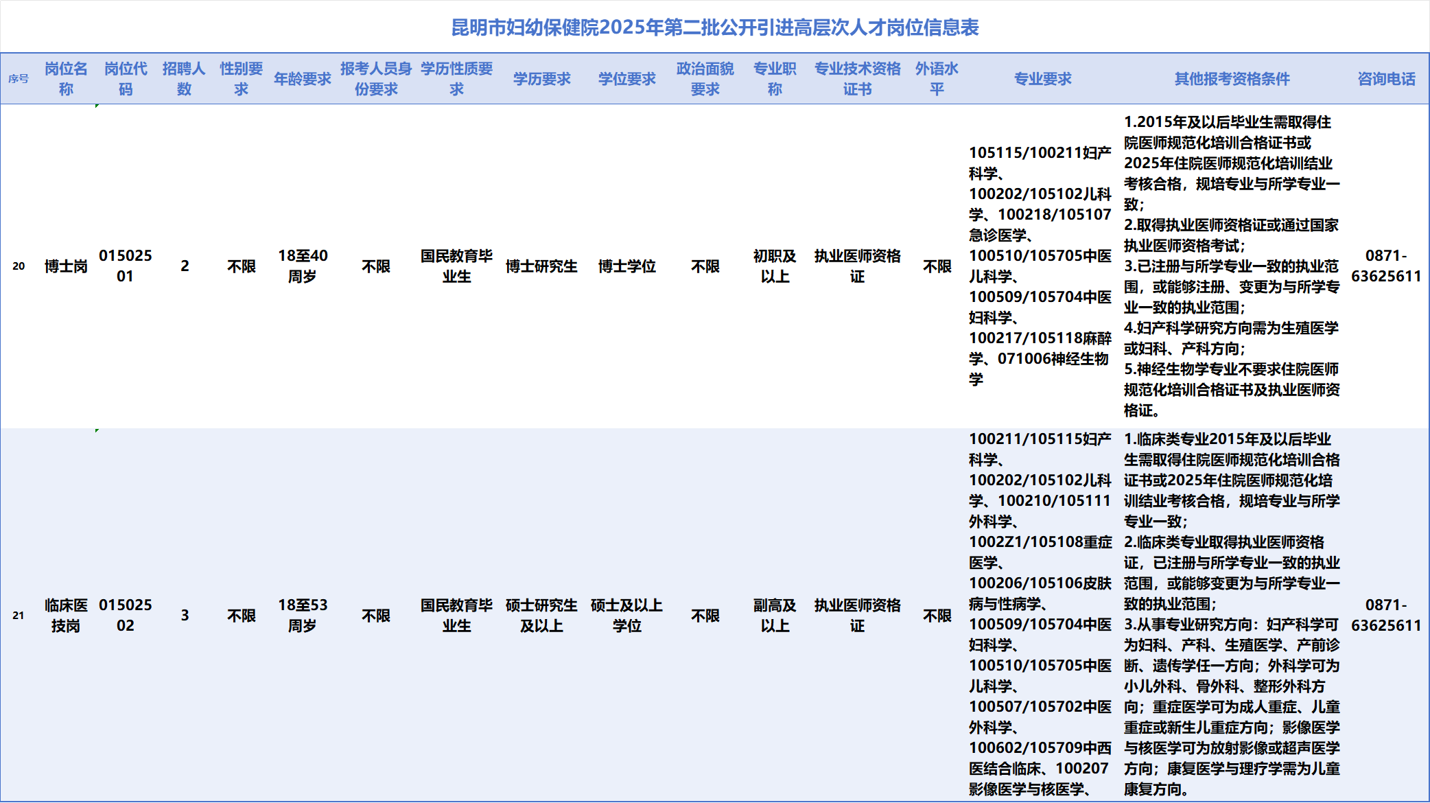 昆明市妇幼保健院本次计划公开引进高层次人才 5 名,具体招聘岗位及招聘条件见《昆明市妇幼保健院 2025 年第二批公开引进高层次人才岗位信息表》