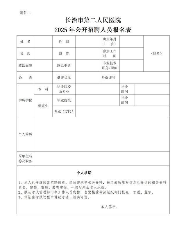 (1)《长治市第二人民医院2025年公开招聘人员报名表》;
