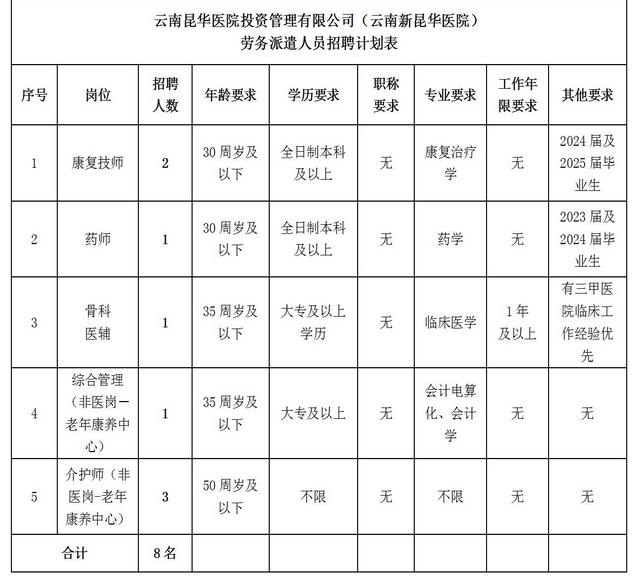 云南昆华医院投资管理有限公司(云南新昆华医院)本次招聘岗位用工方式为劳务派遣,录用人员和第三方劳务派遣公司签订劳动合同,派遣至本单位工作。公开招聘5个岗位,共招聘工作人员8名,具体详见下表: