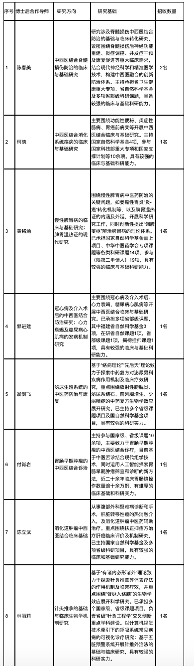 福建中医药大学附属第二人民医院2025年博士后招聘岗位表
