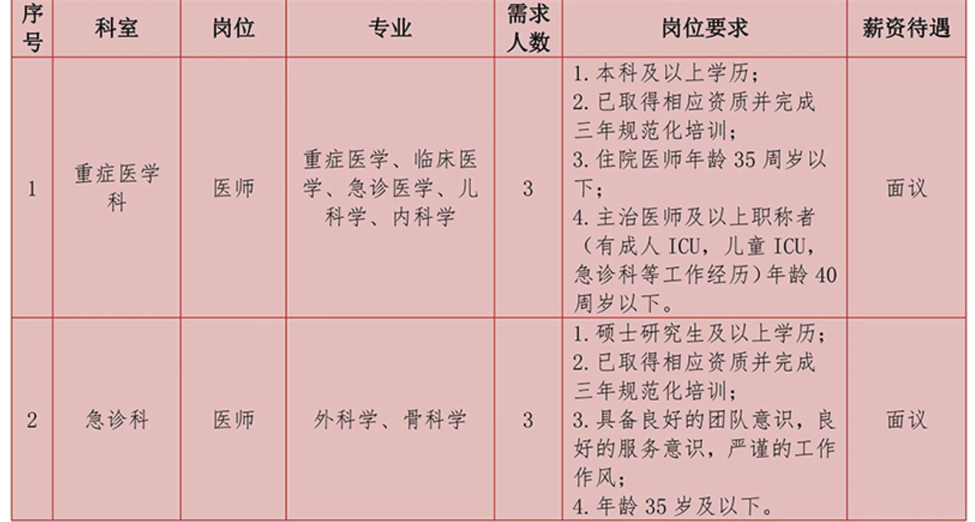 本次招聘面向社会公开招聘重症医学科、急诊科工作人员,设置招聘岗位2个,计划招聘6人。具体岗位设置条件详见公告结尾附件(北京儿童医院顺义妇儿医院用人需求)。