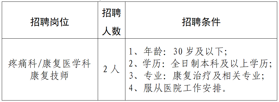 根据医院业务发展需求,现需招聘疼痛科/康复医学科康复技师2人,具体招聘条件如下: