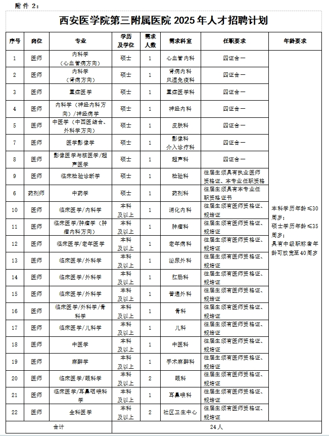 西安医学院第三附属医院始建于1953年,位于古都西安南郊友谊西路277号,是一所集医疗、教学、科研、康复等多功能为一体的三级综合性教学医院。为落实医院2025年度人才招聘计划,为医院建设发展引进储备人才,现将招聘需求公布如下: